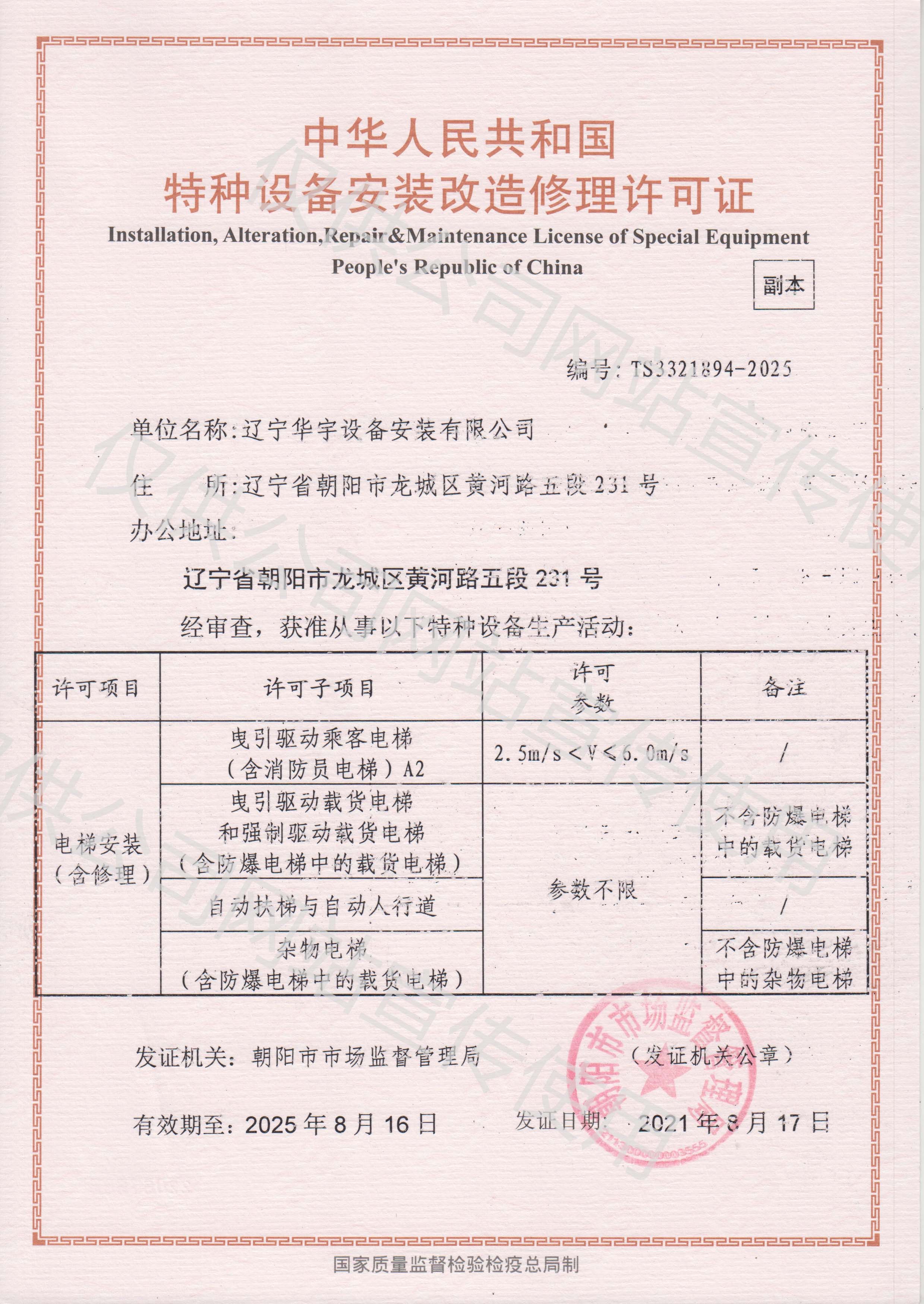 ? ? ? ?? 遼寧華宇設(shè)備安裝有限公司成立于2002年7月15日,注冊(cè)資金10000萬(wàn)。公司占地面積60余畝,建筑面積4000余平。現(xiàn)取得消防設(shè)施工程專(zhuān)業(yè)承包一級(jí)資質(zhì)、消防設(shè)施維護(hù)保養(yǎng)檢測(cè)一級(jí)資質(zhì)、建筑機(jī)電安裝工程專(zhuān)業(yè)承包一級(jí)資質(zhì)、電子與智能化專(zhuān)業(yè)承包二級(jí)、建筑裝修裝飾工程專(zhuān)業(yè)承包二級(jí)、安全技術(shù)防范設(shè)施設(shè)計(jì)施工二級(jí)資質(zhì)、建筑工程施工總承包三級(jí)、電力工程施工總承包二級(jí)、輸變電工程專(zhuān)業(yè)承包二級(jí)資質(zhì)、電力承裝、承修、承試三級(jí)資質(zhì)、鋼結(jié)構(gòu)工程專(zhuān)業(yè)承包三級(jí)資質(zhì)和地基基礎(chǔ)工程專(zhuān)業(yè)承包三級(jí)。同時(shí)是人防工程通風(fēng)(防化)設(shè)備生產(chǎn)安裝企業(yè),并具備電梯銷(xiāo)售、電梯安